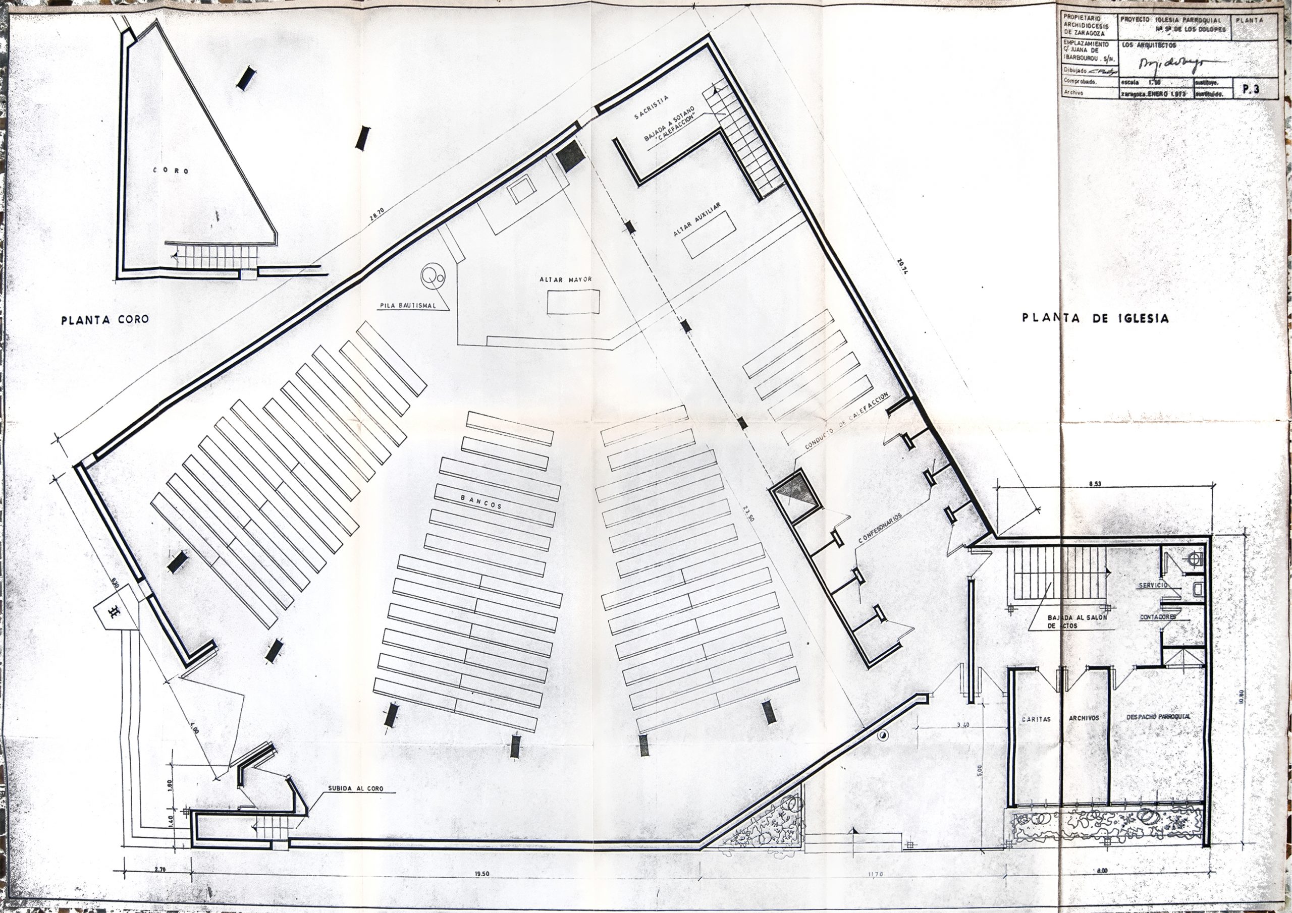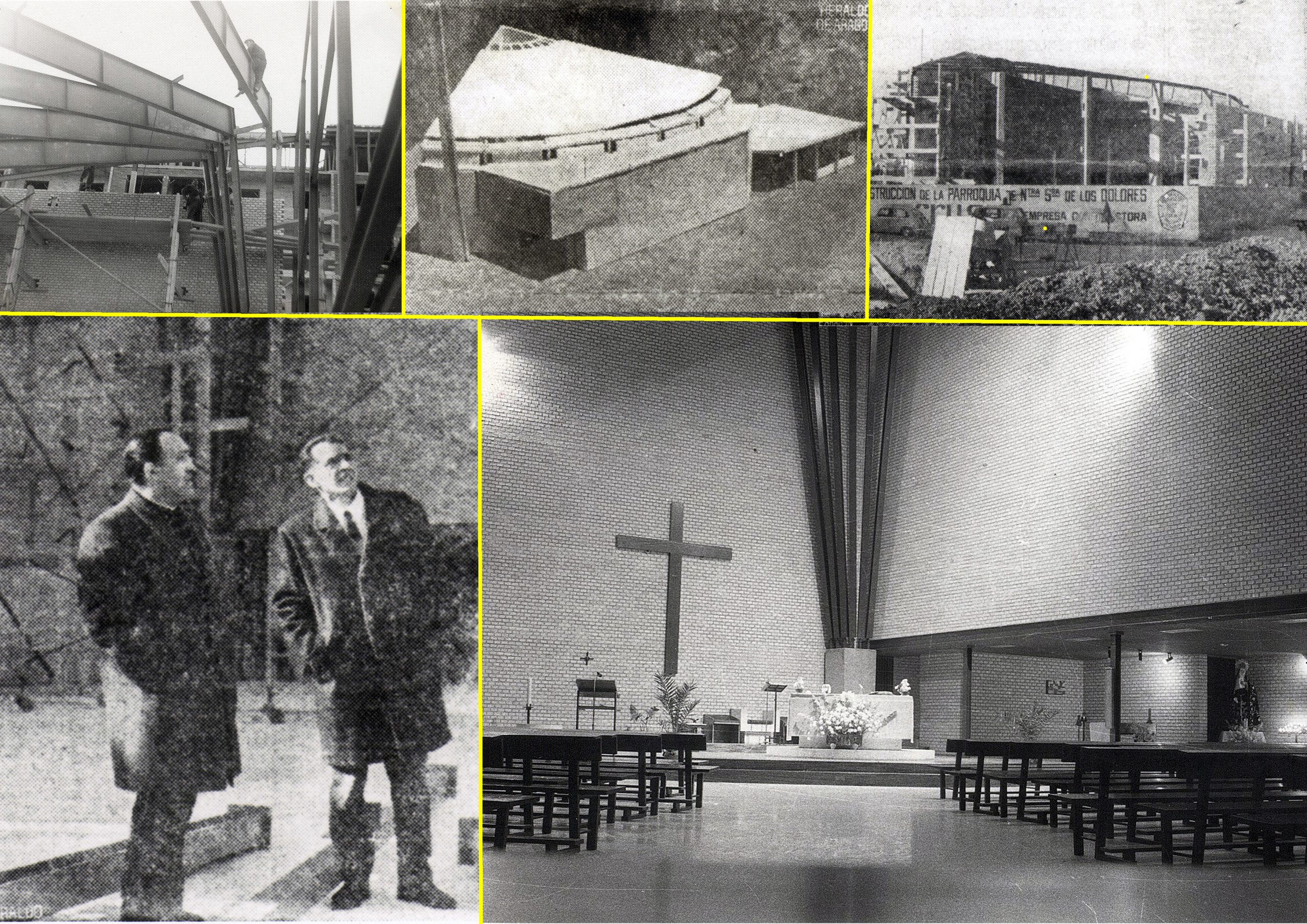 En noviembre de 1961 el arquitecto D. Manuel Martínez de Ubago presentó el anteproyecto de la Iglesia y Centro Parroquial para la parroquia de San Vicente Mártir. En la parroquia de San Vicente Mártir, su párroco, D. Alfonso Aseaso Bardavio, trabaja intensamente para poder realizar el mencionado proyecto parroquial. En 1964 accedió a la Diócesis Cesaraugustana el arzobispo D. Pedro Cantero Cuadrado. El 9 de septiembre de 1968, se firma el decreto de la nueva parroquia de Ntra. Sra. de los Dolores. El sacerdote -D. José Lázaro Espín, es elegido para ser su Ecónomo fundador. Con algunos feligreses preparan la construcción del templo y sus dependencias simplificado los planos iniciales. El 30 de enero de 1969 se firma el proyecto y el presupuesto por parte del arzobispo y del constructor D. Ricardo Lapetra Salvo. El importe de la obra será abonado con el dinero obtenido por la venta de los terrenos anexos al mismo. Comenzaron las obras el 7 de mayo de 1969. Los arquitectos son D. a Raquel Martínez de Ubago y D. Manuel Ramos Martos. En julio de 1971 se publican las primeras cuentas.